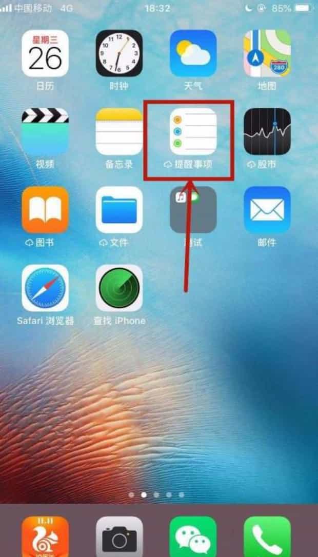1、首先在我们的手机桌面上找到提醒事项并点击它。