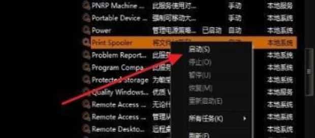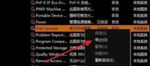 3、找到右侧的【print spooler】项,右键选择【停止】。