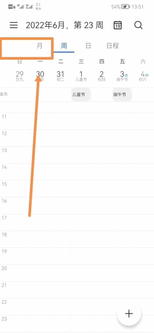 一、华为手机内打开日历,下方已经点击“月”显示,但上方却只显示一周的日历,是因为之前拖动过,把非本周日历给隐藏了。