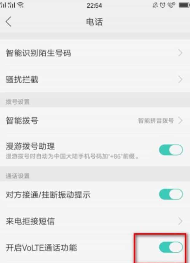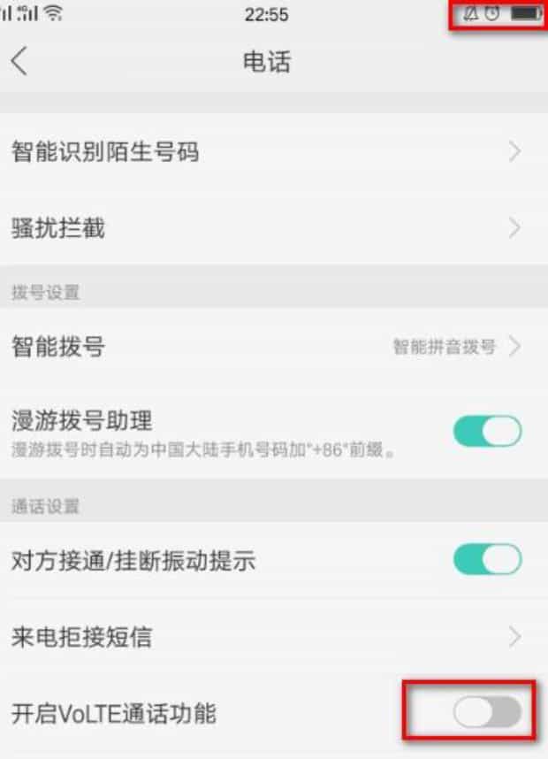 4、点击关闭开启VOLTE通话功能,就关闭了显示HD,屏幕上方就没有HD图标了,如下图所示。