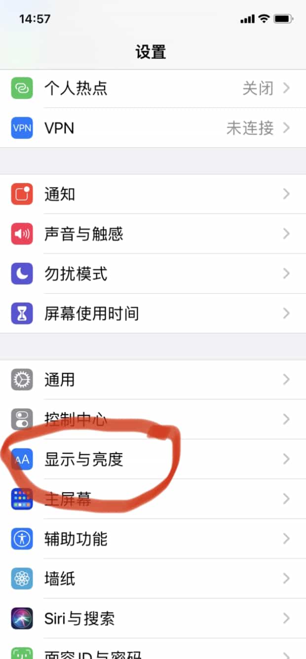 返回“设置”找到“显示与亮度”