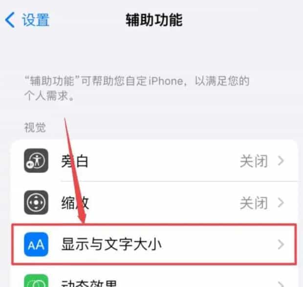 在辅助功能中,点击“显示与文字大小”选项。