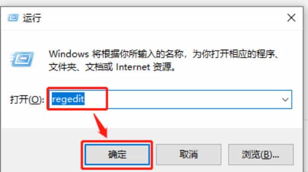 打开之后,在弹出的窗口输入【regedit】,然后点击【确定】: