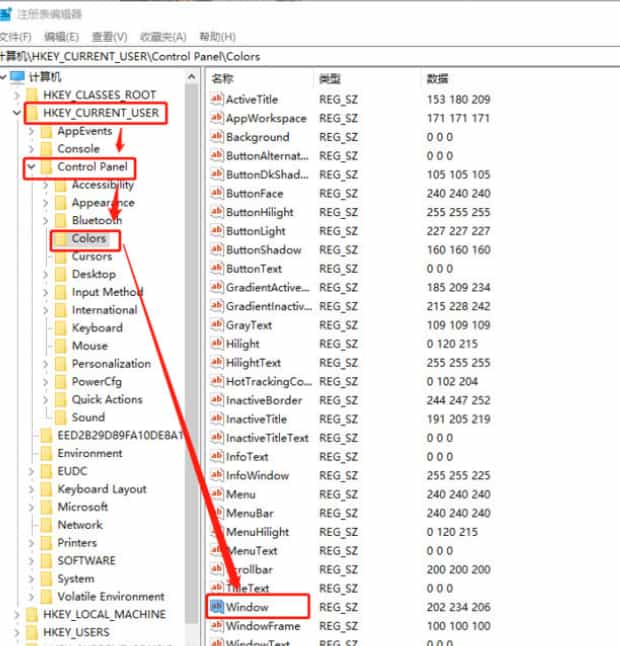 打开界面之后,依次点击左侧文件夹【HKEY_CURRENT_USER】下的【Control Pane】文件夹下的【Colors】,然后双击右侧的【Window】: