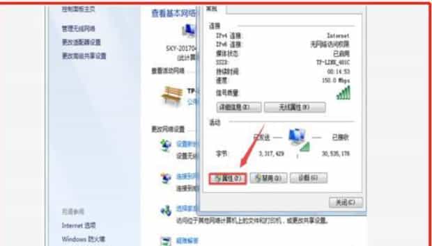 5、点击右下角小电脑,选择“打开网络和共享中心”,然后点击本地连接会出现一个弹框,然后点击【属性】
