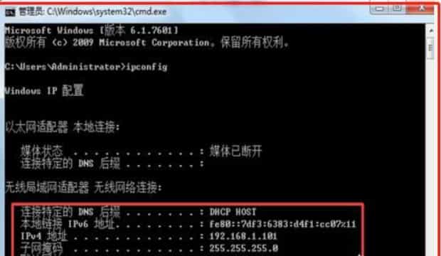 4、然后在命令行输入框中输入ipconfig,查看本机IP地址。记录下本机IP地址。
