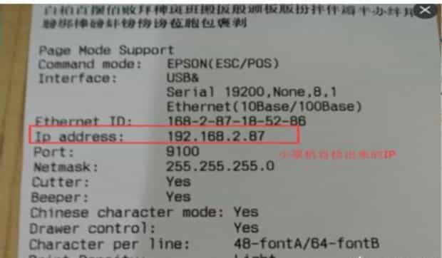 2、然后把打印机电源键关闭,长按住出纸键(Feed)不要松开,再打开电源,等七八秒后在松开,会出一张纸上面记录着打印机的ip地址。记录下打印机ip地址。