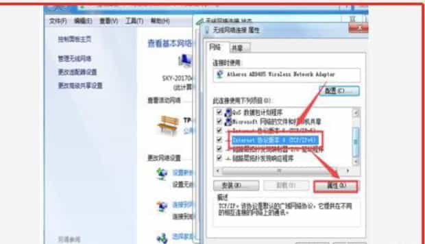 第七:在属性框的列表中选择internet协议版本4,然后选择下边的属性选项,点击就可以进入,如图所示: