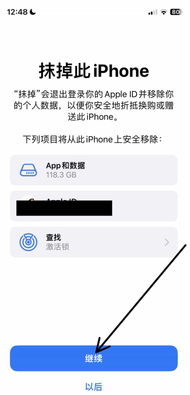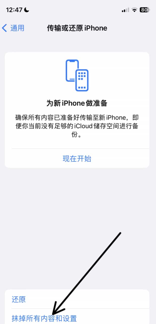 点击抹掉所有内容和设置。