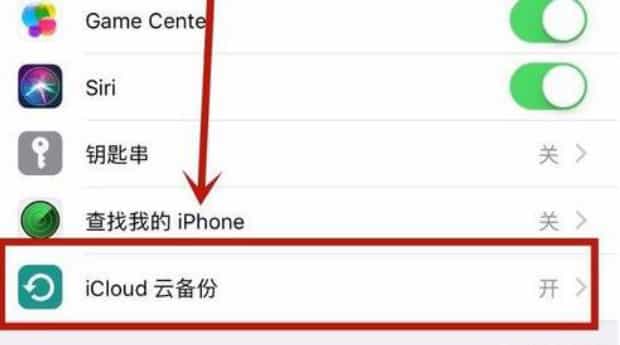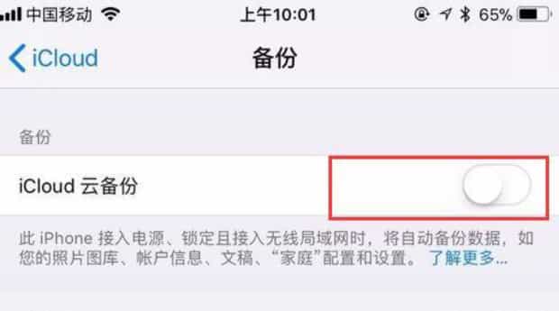 (7)关闭完成以后可以看到iCloud云备份”右边的按钮变为白色。返回到iCloud界面可以看到“iCloud云备份”右边的状态为“关”。