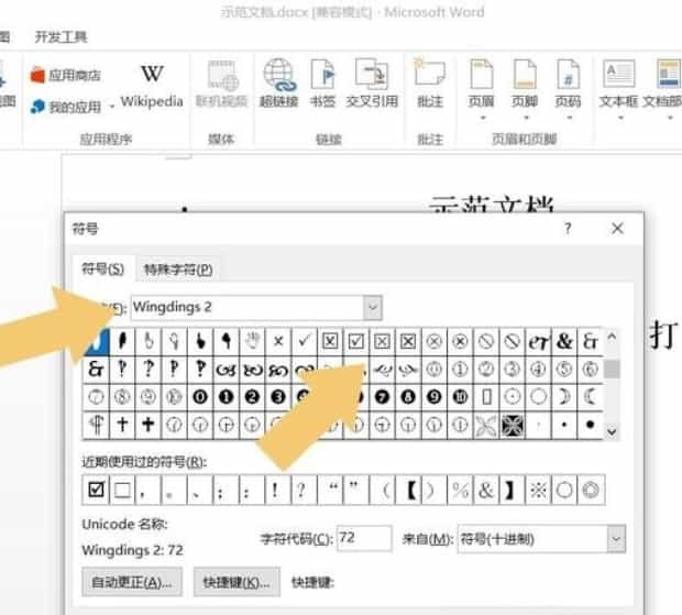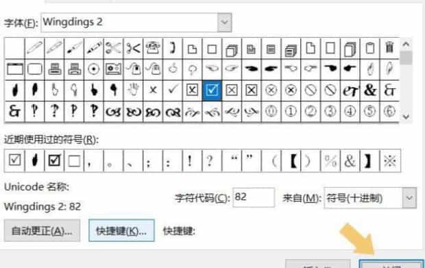 将“字体”设置为“Wingdings 2”,然后在下方的字体内,就可以找到打了勾的方框。