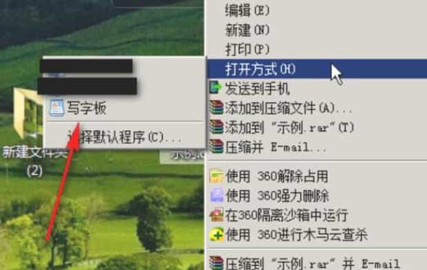 4果然,鼠标放在“打开方式”这里,即显出子菜单,子菜单上显示了,可以打开此文档的所有软件。鼠标点击“写字板”