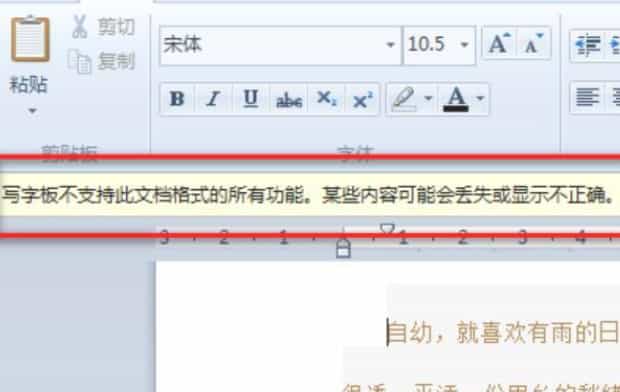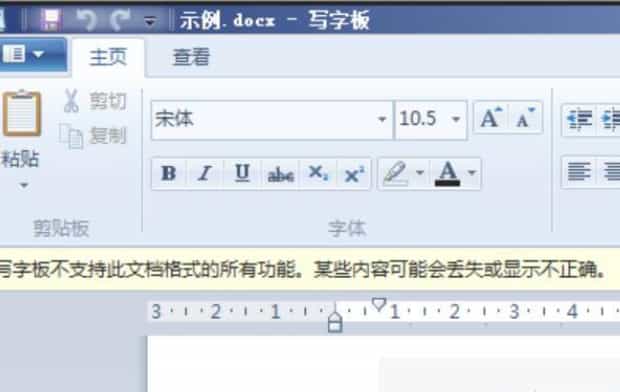 7但“写字板”不支持word文档格式的所有功能。在打开此文档时,在界面上已有警示,如下图所示。但对于只是查看内容是没有问题的。