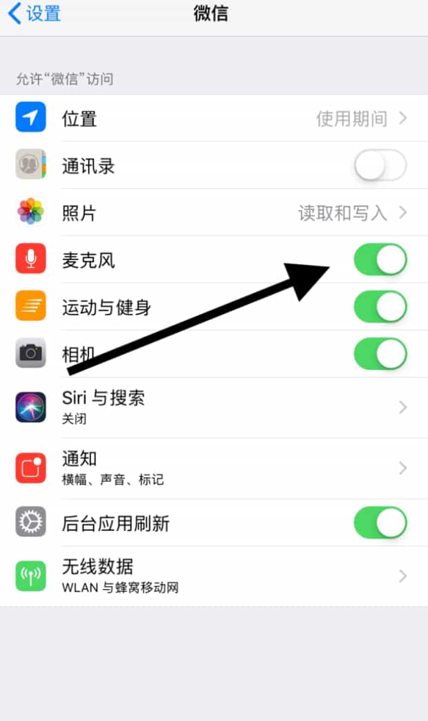 2.进入微信页面后,把麦克风右侧的开关打开