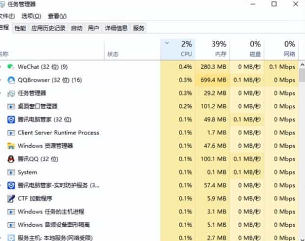 2.在进程中可以观察到电脑运行的所有进程,点击“CPU”,这时占用率最高的进程会出现在最上方,这就是未关闭的进程,选择点击“结束进程”。