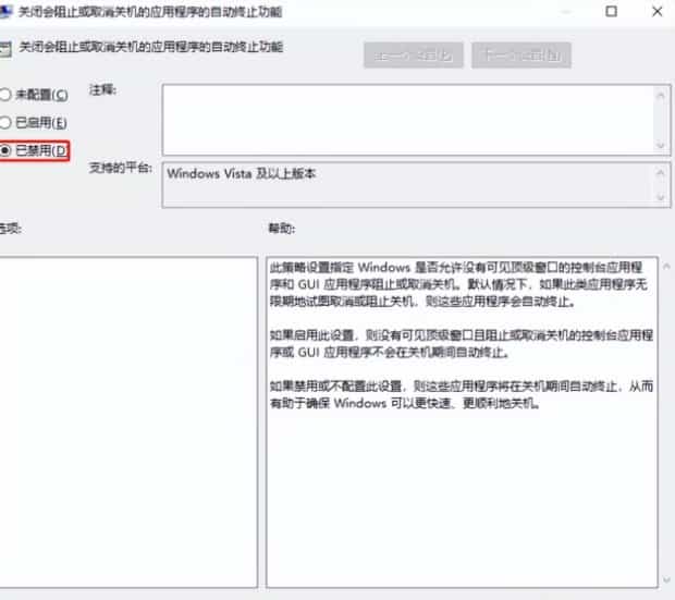 4.关闭会阻止或取消关机的应用程序的自动终止功能窗口,选择【已禁用】,再点击【应用确定】。