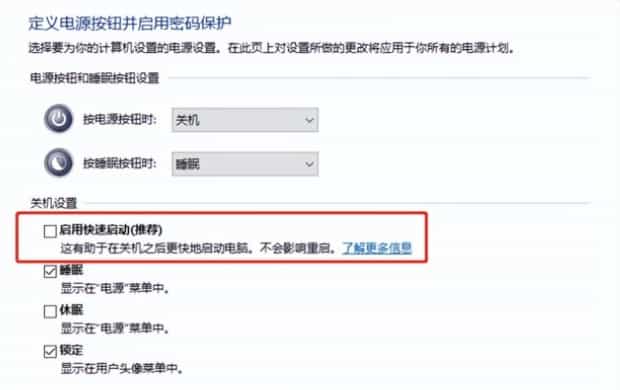 4.关机设置下,【取消勾选】启用快速启动(推荐),最后,点击【保存修改】即可。