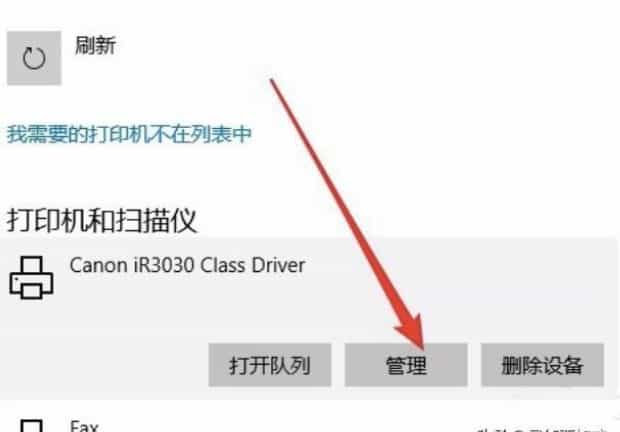 4、在右侧选择我们出错的打印机,点击后在弹出菜单中选择“管理”按钮;