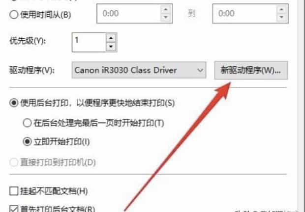 7、在打开的高级窗口中,我们点击“新驱动程序”按钮,然后在弹出的窗口中重新启动驱动程序。完装完成后点击重新启动计算机,再次打印就不会出现脱机而无法打印的情况了。
