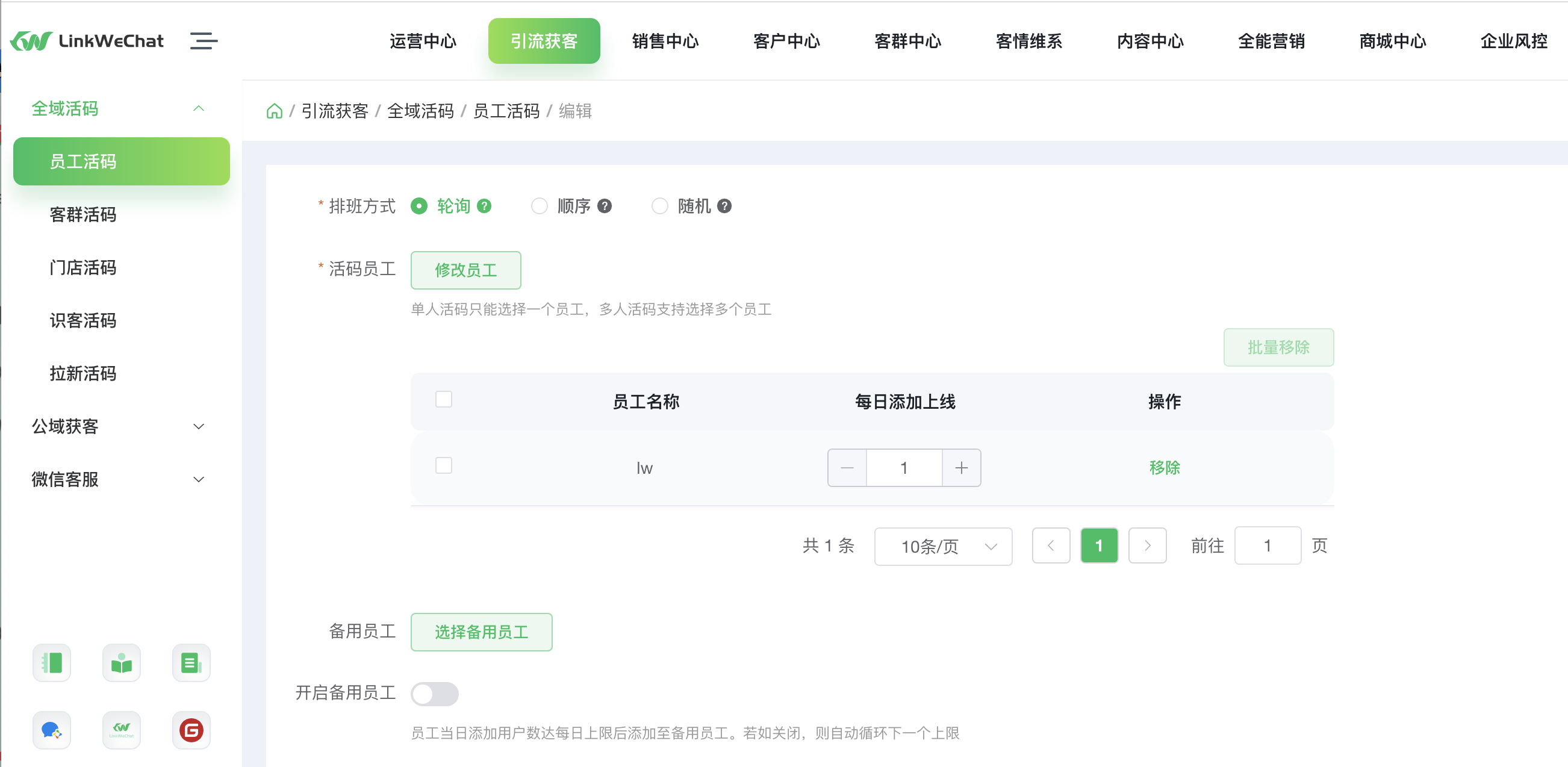 2、员工活码功能升级优化,新增员工活码排班方式(轮询,顺序,随机)、备用员工等功能;