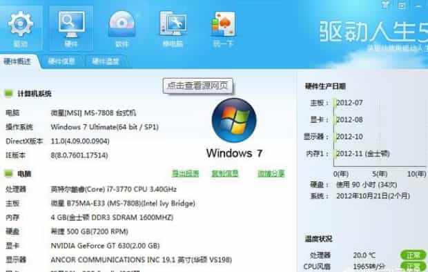 2、运行驱动人生,点击“硬件”,即可看到PC的型号和配置参数。