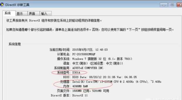 2、在DirectX诊断工具界面可以看到PC配置信息和型号。
