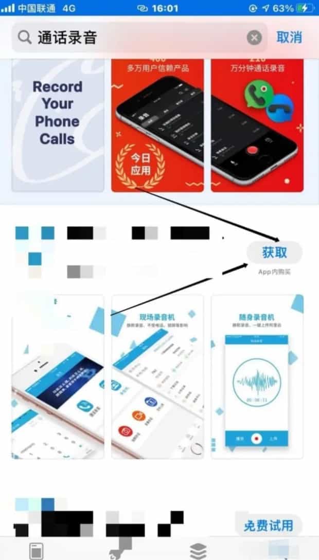 方法三:点击桌面的“App Store",然后搜索“通话录音”,即可获得众多具有录音功能的软件,选择您喜欢的一款点击“获取”下载即可。