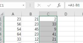 3、需要处理数据较多的话,我们现在需要一个跟简单的的方法使下面列中的求差变得方便,我们首先选中把鼠标移动到单元格的右下角,你会发现一个小十字架,然后拖住十字架往下拉,就像格式一样所在列中的单元格都有结果了。