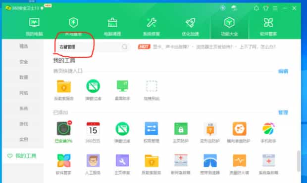 输入“右键管理”,按回车键进行搜索