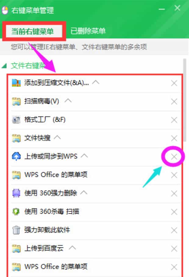 第六:选择不需要的点击“x”,这样就会在右键菜单栏中消失。