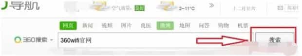 2、在浏览器界面搜索框中键入“360wifi官网”后单击后方“搜索”按钮或点击回车键进行搜索。