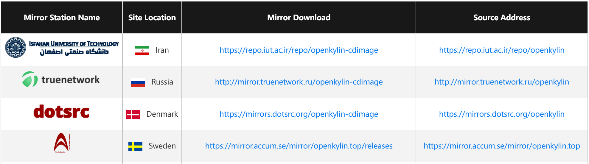 随着openKylin社区国际化的不断推进,目前,已经有来自丹麦、伊朗、瑞典和俄罗斯等国家的爱好者联系社区在当地建立了镜像站,为openKylin提供镜像服务。