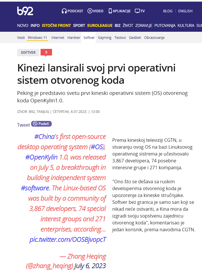 openkrini,近期,openKylin 1.0的正式发布吸引了海内外用户、开源开发者和媒体的广泛关注。除央视、人民日报等多个国内权威媒体报道外,还有新加坡《海峡时报》、B92新闻网、厄瓜多尔新闻网、智利13频道、俄罗斯科技网站IXBT、美国科技新闻门户网站gadget tendency等海外30余家媒体的强势聚焦,报道以中文、英文、俄语、西班牙语、阿拉伯语、塞尔维亚语等多种语言传播,覆盖面高达上亿人次。
