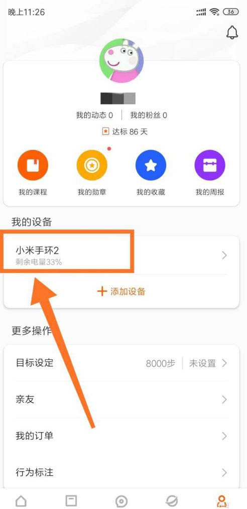 第一:打开小米运动APP,在“我的”界面点击绑定的小米手环4。