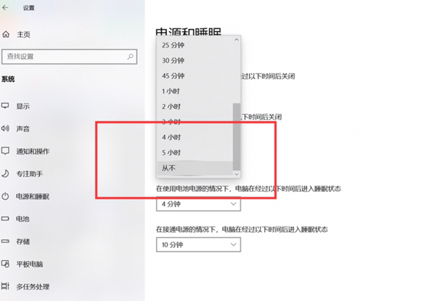 第四:进入页面,将显示器关闭为“从不”,将计算机从睡眠状态设置为“从不”,然后保存修改。