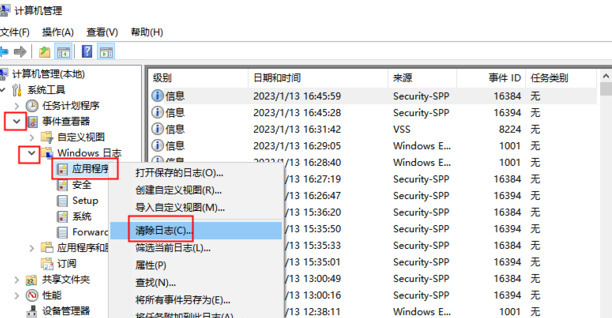 第二步:依次点击【事件查看器】-【Windows日志】,选中【应用程序】并按下鼠标右键,选择【清除日志】。