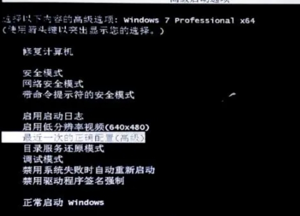 1、恢复最近一次正确配置。电脑启动到这个画面的时候按键盘上面的“F8”键。电脑开机以后,反复按键盘上方的“F8”键,不停地按,直到出现如图的画面。然后按键盘上的方向键,移动光标到“最近一次正确配置(高级)”上,然后按“回车”键,电脑就能顺利启动了。这个方法可以解决70%的电脑开机蓝屏故障。有的电脑“F8”键和开机选择启动设备选择项冲突,出现选择启动设备的时候,选择启动磁盘,按一下“回车”键,继续按“F8”键即可。