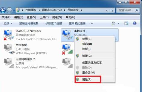 在网络连接界面中找到【本地连接】(看电脑连网的方式)并鼠标右击,点击【属性】。