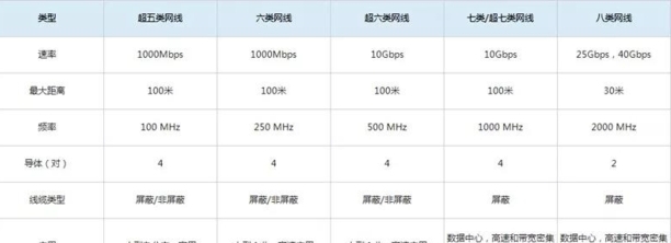 目前市面上常见的网线有超五类网线、六类网线、超六类网线以及七类、超七类这五种类型,那么Cat8 八类网线与这些网线之间存在怎样的区别?我们来看一组网线参数