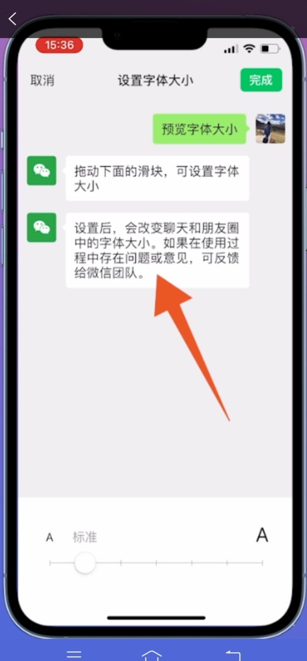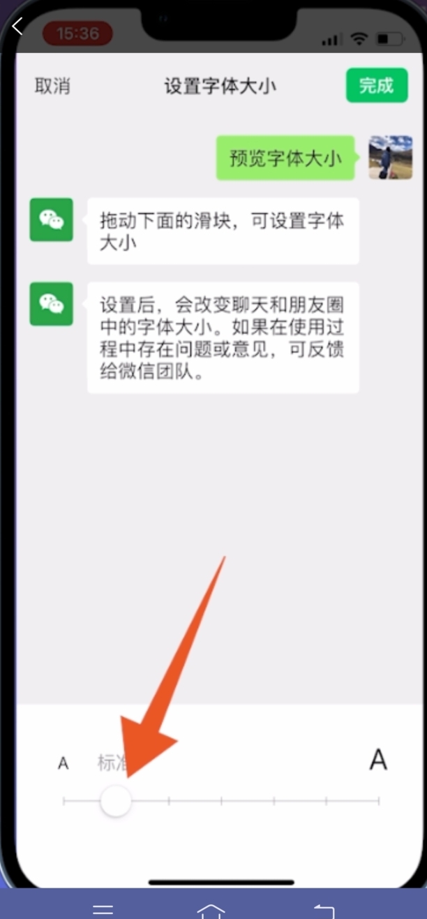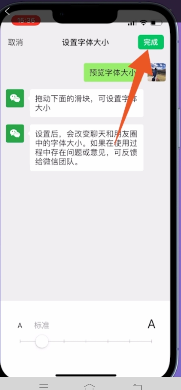 接着在设置字体大小界面,右上方位置点击完成,即可调节微信页面界面的大小。
