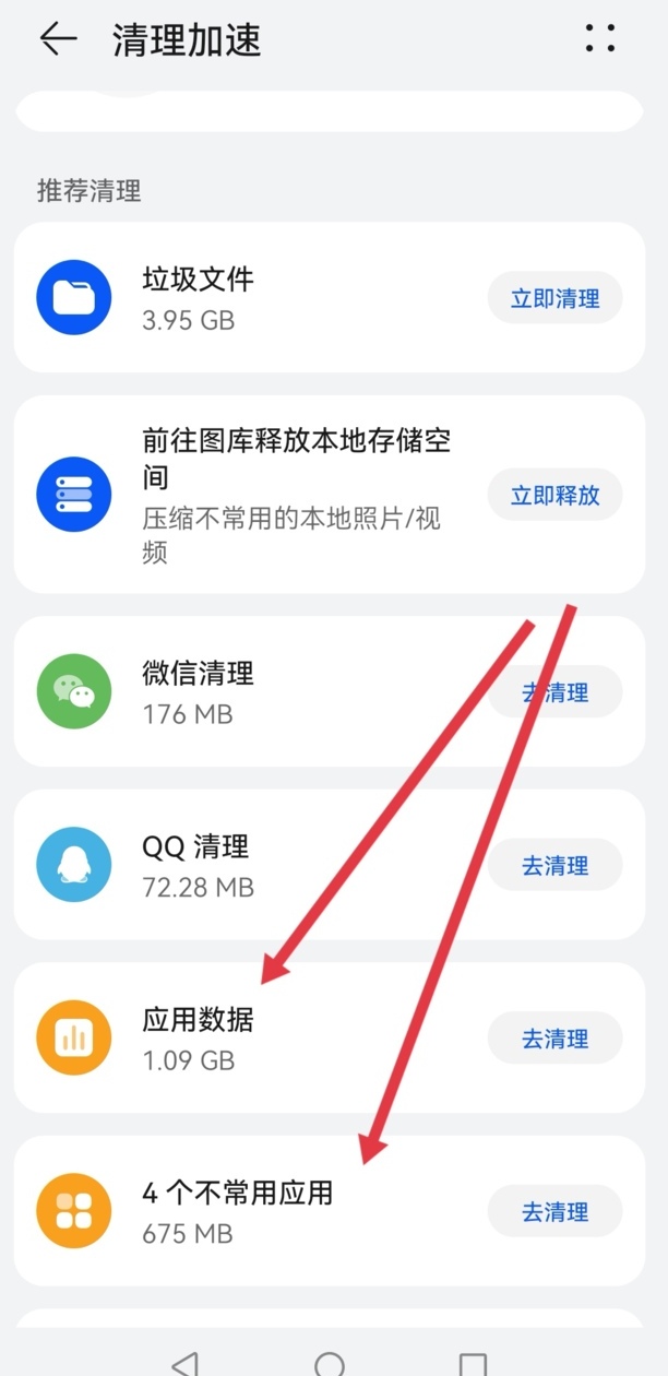 在推荐清理中选择应用数据和不常用应用