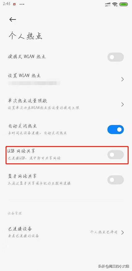 3. 在“个人热点”中我们可以看到“USB网络共享”,这个时候我们将它打开,电脑即可享受手机的流量来进行上网了。