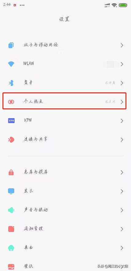 2. 点开手机“设置”,点击“个人热点”进行网络共享;
