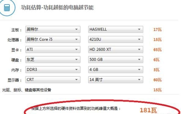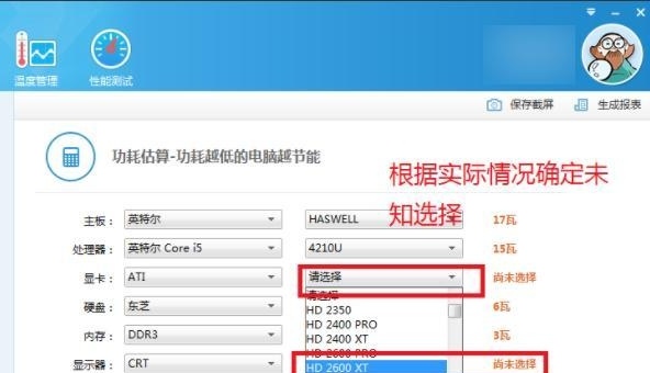 然后在功耗估算界面内找到并将为未知项的选项设容置好。