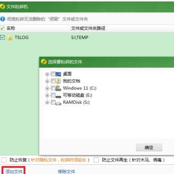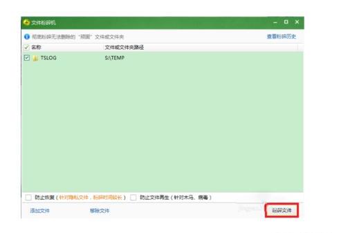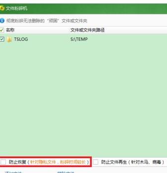 第二:点击他之后就可以打开文件粉碎机,在左下角会看到一防止恢复的命令,在前面勾选他然后确定。