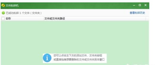 第四:界面的左下角会有个添加文件的按钮点击选择他,或者直接把文件拖到粉碎机的窗口里,这里可以同时粉碎好几个文件或者文件夹,所以有需要删除的可以一并拖入。