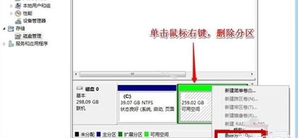 6、然后在可用空间单击鼠标右键,选择“删除分区”