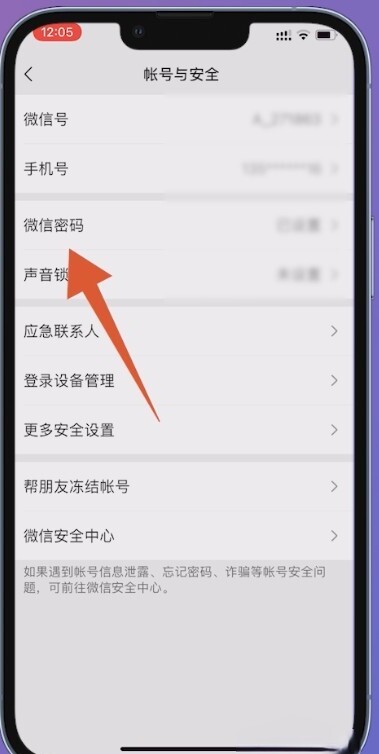 在帐号与安全的页面中,通过点击微信密码,跳转到新页面。