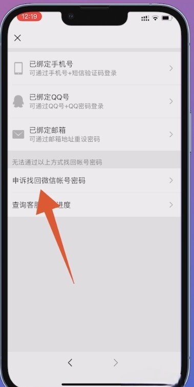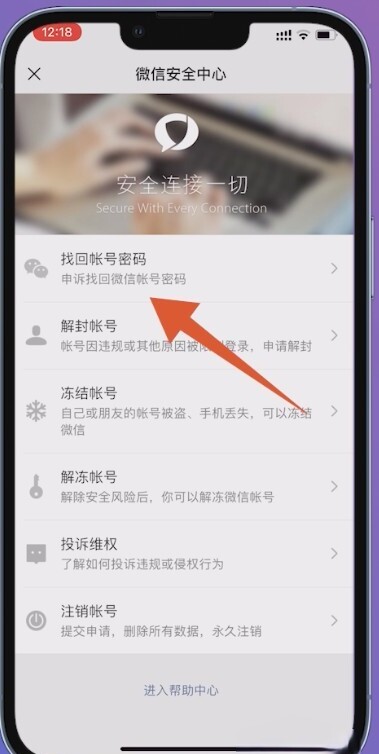 在微信安全中心的页面中,通过点击找回帐号密码,跳转到新页面。