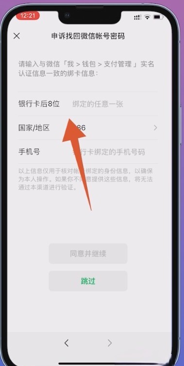 接着输入自己微信绑定的银行卡信息,再次点击同意并继续。